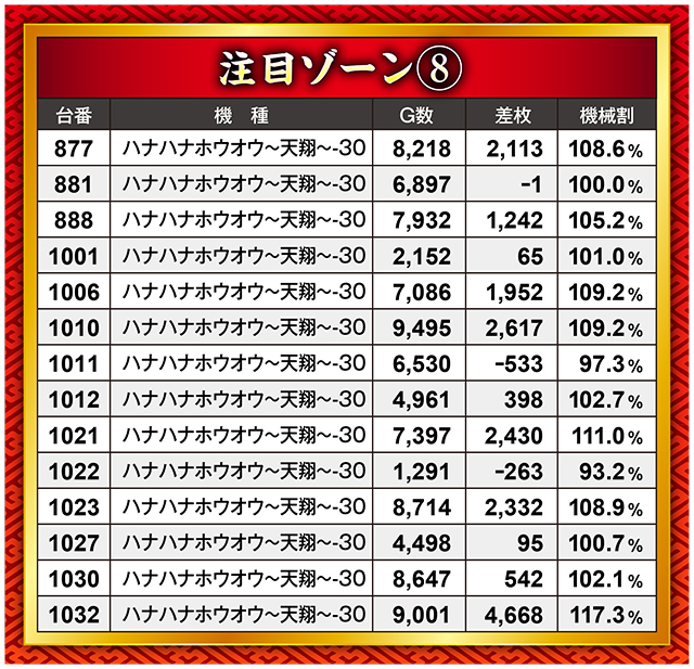 「ガッツリ回された台はプラス」「あまり回されなかった台はちょいプラスorマイナス」という、実に実直な結果となった『ハナハナホウオウ~天翔~-30』。Aタイプならではの結果と言えよう。