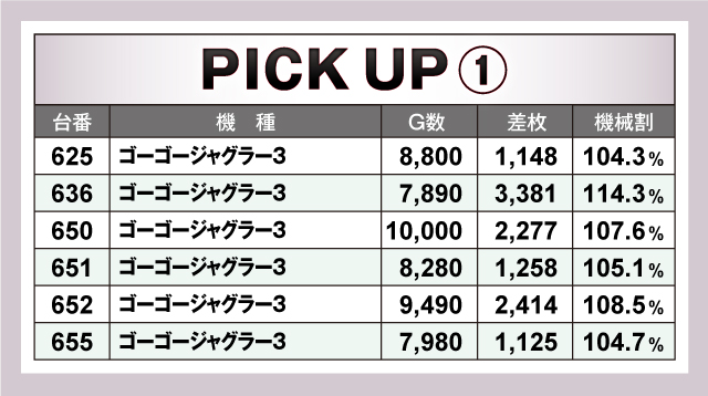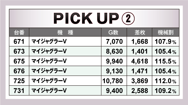 続いては、とくに目立って活躍していた2機種「ゴーゴージャグラー3」「マイジャグラーV」を紹介。ピックアップ2機種12台全てが+1,000枚以上のプラスで、ノーマルタイプながらハイスペック機種に負けない好結果をマーク! 回転数もほぼ終日ぶん回し状態だったことから、ベースはかなり高かった可能性が高い!
