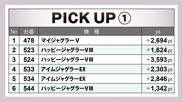 4機種計64台設置と、同店の3分の1近くを占めるジャグラーシリーズ。4桁プラスを計上したのが上の6台で、最高値は『ハッピージャグラーVⅢ』524番台の+3千6百弱となった。