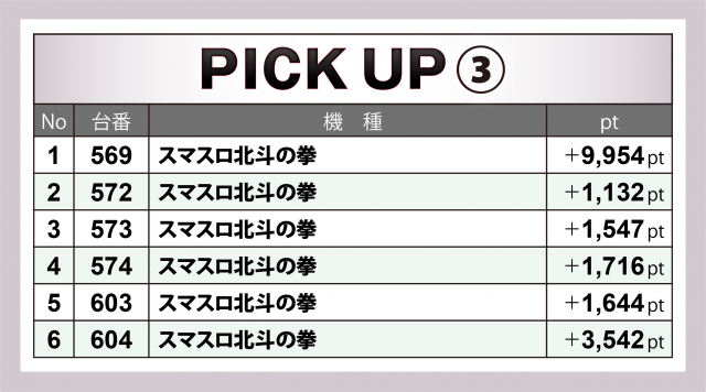 スマスロ機では『スマスロ北斗の拳』に注目。シマトップの569番台は万枚達成ギリギリに至り、604番台が+3千5百超で続いた。