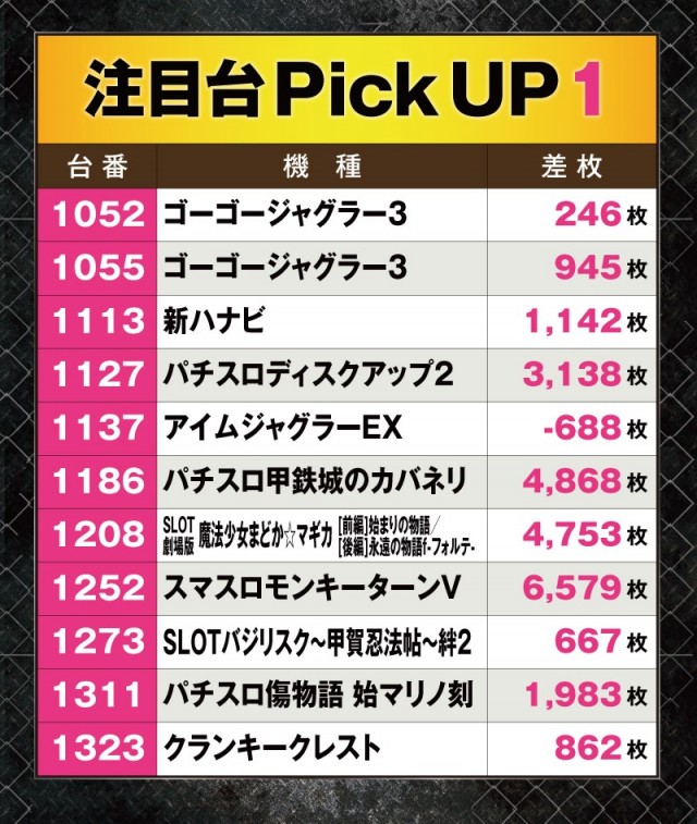 特に『スマスロモンキーターンV』は+6,579枚と華麗なパフォーマンスを披露していた。さらに『パチスロ甲鉄城のカバネリ』や『スマスロ劇場版 魔法少女まどか☆マギカ[前編]始まりの物語/[後編]永遠の物語f-フォルテ-』は4,000枚を超えており、プレイヤーたちからは笑顔がこぼれていた。