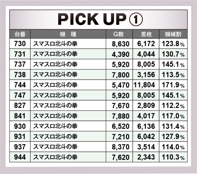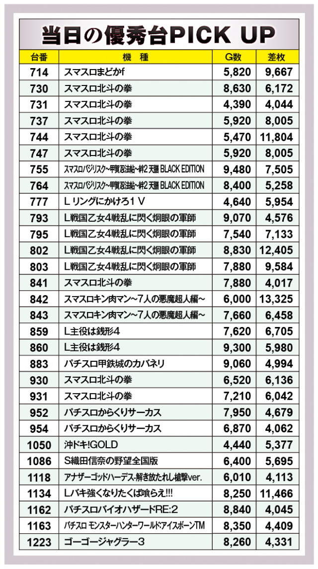 まずは優秀台30台のピックアップから。30台全台が+4,000枚オーバーを記録!さらに+5,000枚オーバーは20台、+6,000枚オーバーは15台、そして+10,000枚オーバーが4台出現するほどの盛り上がりぶり! 後述する好調機種以外では、842番台の『スマスロキン肉マン~7人の悪魔超人編~』で+13,325枚、ついで1134番台の『Lバキ強くなりたくば喰らえ!!!』で+11,466枚、さらに714番台の『スマスロ劇場版 魔法少女まどか☆マギカ[前編]始まりの物語/[後編]永遠の物語f-フォルテ-』で+9,667枚をマーク。 ランクイン台を見渡すと、スマスロがやはり圧倒的存在感を放っていた。