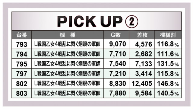 続いては好調2機種計18台をみていこう。まずは『スマスロ北斗の拳』で、万枚超を記録した744番台の+11,804枚を筆頭に12台のトータル差枚数は+66,000枚オーバーと圧倒的な結果をマーク!また、『L戦国乙女4戦乱に閃く炯眼の軍師』でも、万枚超を記録した802番台の+12,405枚を筆頭に6台のトータル差枚数は+39,000枚オーバーとなった。いずれも右肩上がりのグラフを形成しており、ファンは好展開に恍惚の表情を浮かべていたことだろう。