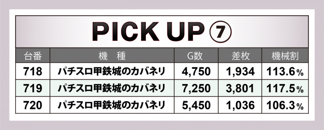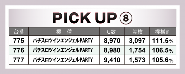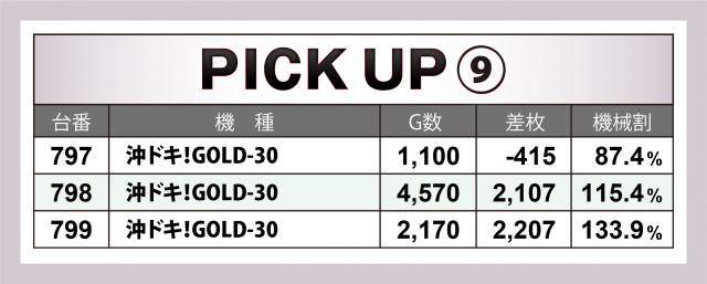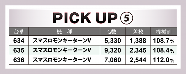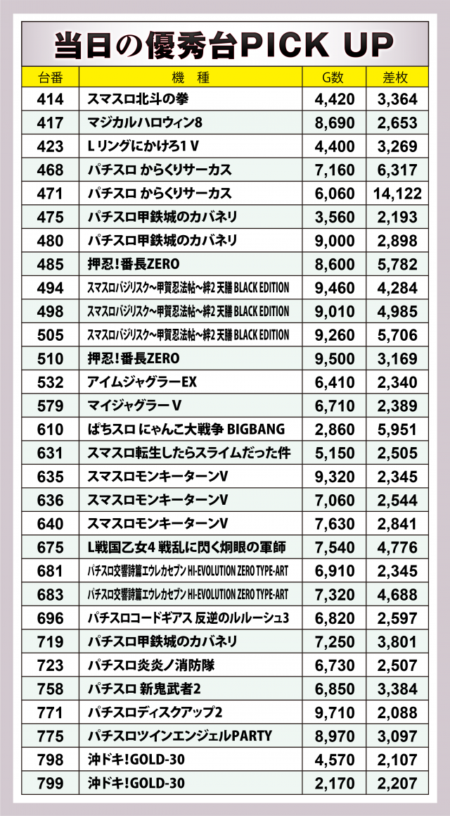 最初は優秀30台PICK UPからチェック。同店ではよく見られる光景だが、30台の全てが+2千枚以上を達成。さらに、+3千枚以上は全体の半数となる15台、+4千枚オーバーは9台、+5千枚オーバーが5台、+6千枚オーバーが2台と、直近数回に引けを取らない出来となった。