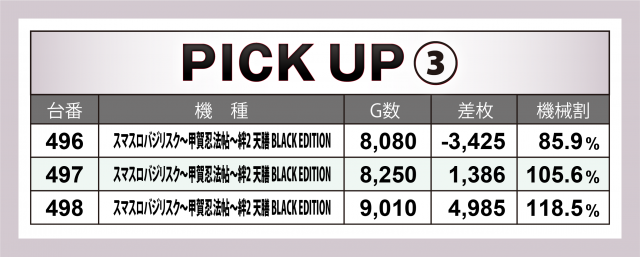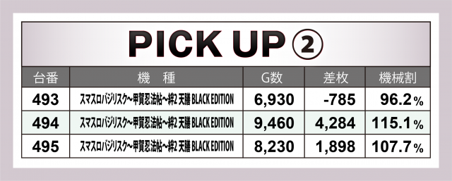 導入間もない『スマスロバジリスク~甲賀忍法帖~絆2 天膳 BLACK EDITION』6台では、+5千枚弱&+4千3百枚弱が1台ずつ生み出された。