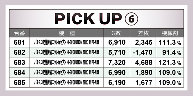 5台が対象となった『パチスロ交響詩篇エウレカセブン HI-EVOLUTION ZERO TYPE-ART』は全台プラスは逃したものの、+4千7百枚弱の台を頂点に5台で+9千枚を突破。