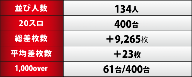 今回、[1000円/46枚]スロ全400台のトータル差枚数は+9,265枚と勝利を成し遂げた。万枚突破台が生じたことも喜ばしい結果だ。
