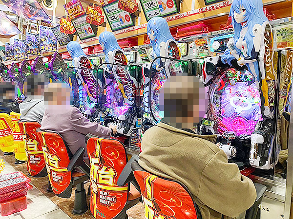 15時半ごろの4円パチンコでは「ぱちんこ シン・エヴァンゲリオン Type レイ」や「Pスーパー海物語 IN 沖縄5」が人気で、プレイヤーの嬉しそうな表情を幾度も確認している。