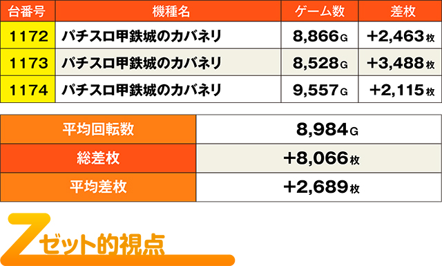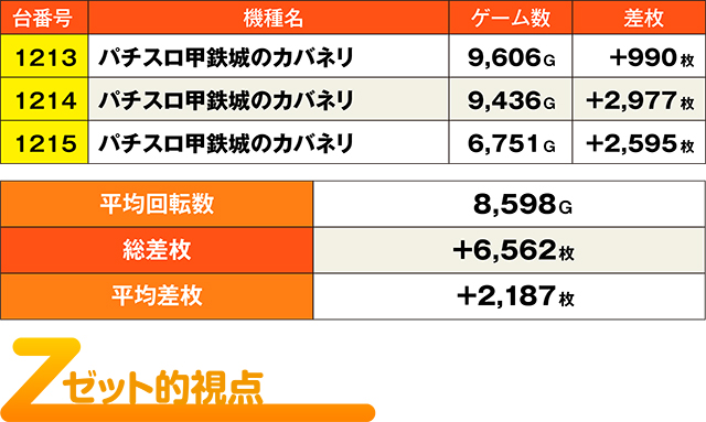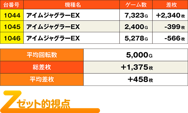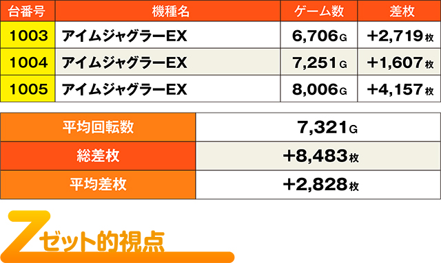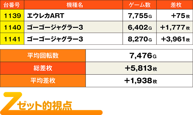 こちらの3台並びも先ほどの3台に匹敵するほど強力!なんと3台ともが+2,200枚を上回っており、その平均はまさかの+2,792枚に!