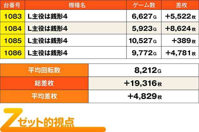 文句なしの逮捕劇を披露してくれたのは『L主役は銭形4』。4台並びで4台ともがしっかりプラス、しかも1083・1084番台の2台は5,000枚を上回る大記録を打ち立ててくれた。
