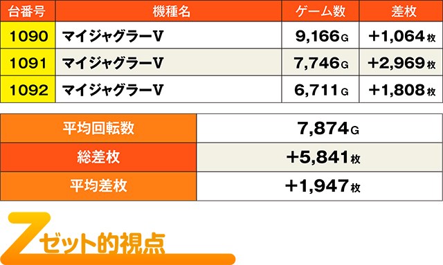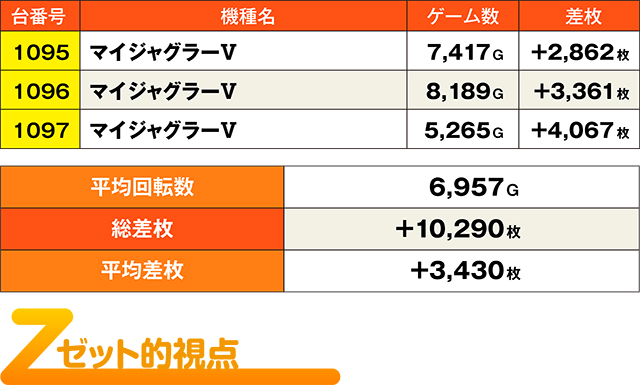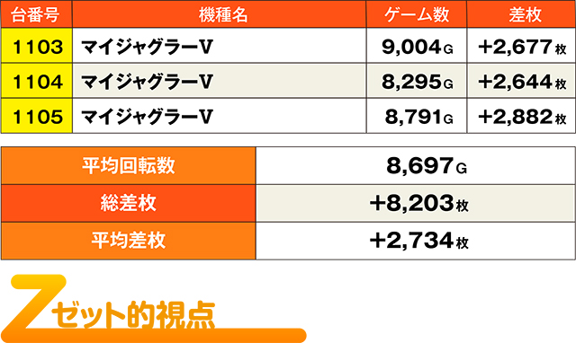 『マイジャグラーⅤ』3箇所目の3台並びも優秀台を確信させるに十分な差枚結果となった。3台ともが8,000G以上回されてのこの結果である。