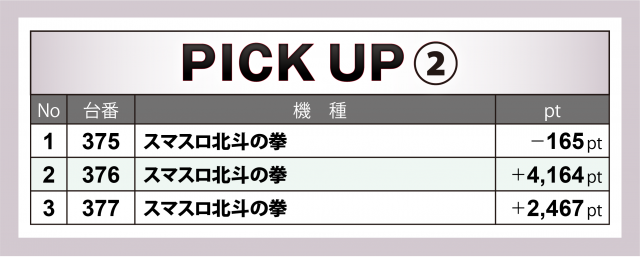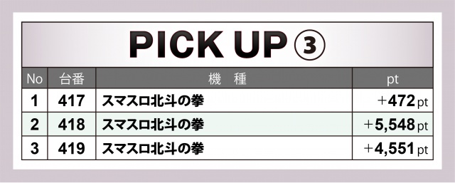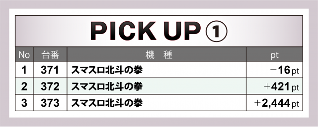 『スマスロ北斗』以外にも機種跨ぎの3台並びの好況スポットがあり、ベテランマシンである『押忍!番長ZERO』には+6千超&+4千超が1台ずつ輩出された。