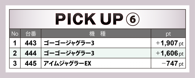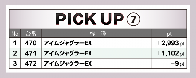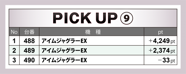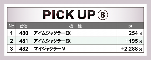 ジャグラーシリーズ4機種にも好調台あり。中でも『アイムジャグラーEX』に好成績が連発、488番台の+4千2百超を始め、+2千超と+3千弱が1台ずつカウントできた。さらに他3機種でも4桁のプラス台が生じていた。
