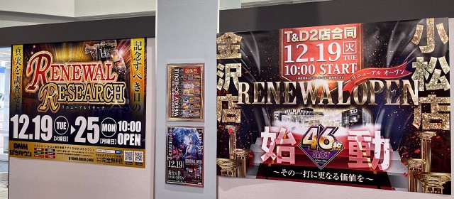 様々なホールの「新生」に迫る取材が「リニューアルリサーチ」。今回、12月19日(火)に取材を行った「T&D 小松店」。当日はグループ店である「T&D 金沢店」と合同でのリニューアルオープンと相成った。
