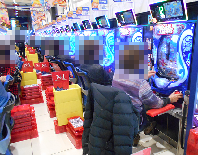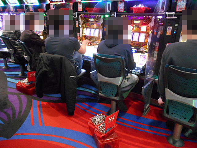 機種の性能を引き出しているようなプレイヤーは、「P大海物語5」にも多数。4箱以上や大箱3箱以上の持ち玉で遊技をおこなう姿が並んでいた。