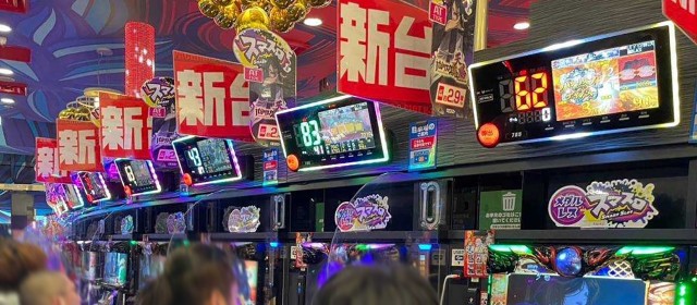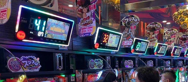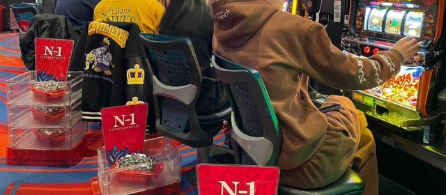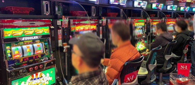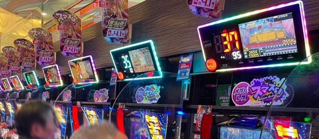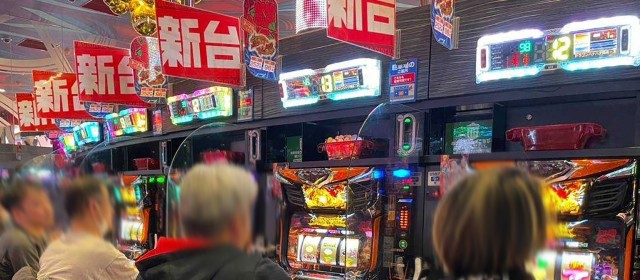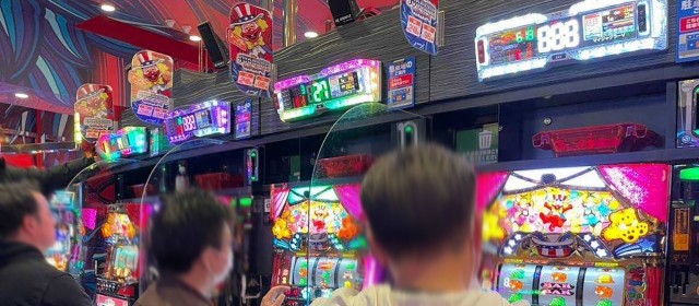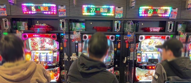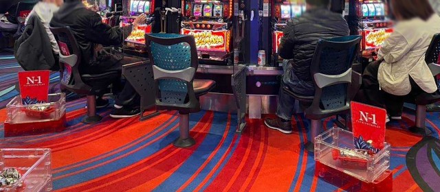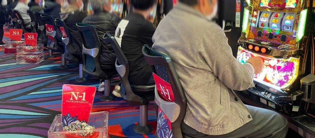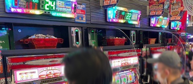 『マイジャグラーⅤ』『ゴーゴージャグラー3』『アイムジャグラーEX』の3機種は今回もギッシリと客が着席。午後の早い時間帯でありながら台上カウンターには30前後のボーナス回数が連発、頭上はもちろんのこと別積みによるドル箱も複数見受けられた。