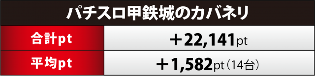 『カバネリ』14台は+2万オーバーの合計ptを達成し、『スマスロ北斗』に次いで4桁の平均ptとなった。プラス台の割合は71%(10台)と上の機種に匹敵する高さで、1,000overは8台、コーナー首位の1022番台は+5千5百弱、+4千超が1台&+3千超が4台と、他5つに勝るとも劣らない出玉となった。