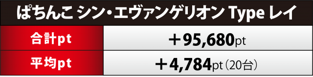 主軸5マシンの中で最も高い合計ptとなったのが『シンエヴァ レイ』で、+9万6千間近に到達。プラス台は9と半数に届かなかったものの、5桁プラスは7台、+5万2千弱・+5万弱・+4万弱が1台ずつと、導入直後にビッグな出玉を魅せた。