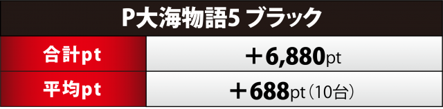 ライトミドルスペックの『大海5ブラック』10台も機種トータルプラスとなったが少し寂しい結果に。プラス率は50%(5台)と上の機種に劣らず、150番台が+2万4千超という好出玉となったものの、マイナス台による数字の大きさが全体の合計に響いた。
