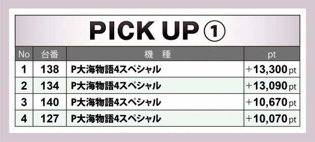 『大海4SP』20台はプラス台の割合が35%(7台)と半数に届かなかったこともあり合計ptでプラスを逃したが、4台が5桁のプラス差玉となるなど、全く手が出せないといった状況ではなかったようだ。