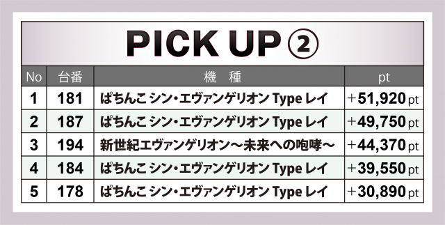 前回からの大きな変更としては『新世紀エヴァンゲリオン~未来への咆哮~』が40台から20台となり、代わりに『ぱちんこ シン・エヴァンゲリオン Type レイ』が20台導入、今回から対象に加える。ちなみに『P大海物語5』『P大海物語5 ブラック』『P大海物語4スペシャル』には変更なく、同様に観測を続けていく。