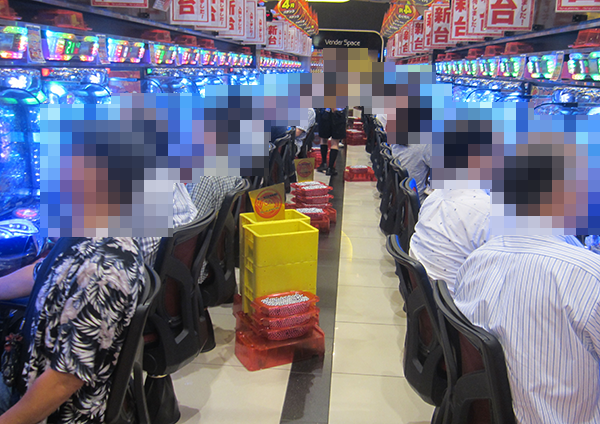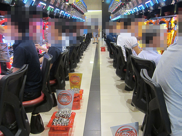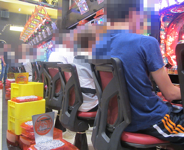 15時頃の20円パチスロにおいて、もっとも目立っていたのが「沖ドキ!-30」やハナハナシリーズといった沖スロ。シンプルな告知を味わっていると思われる姿が多く、満足度の高さがうかがえた。