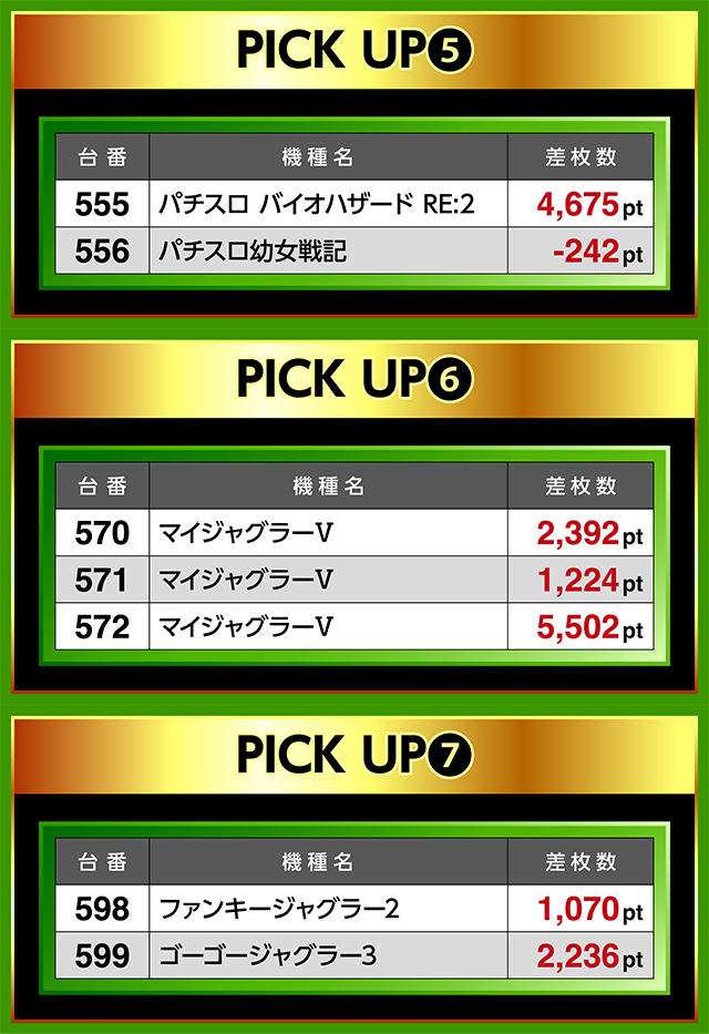 570番台から572番台までの「マイジャグラーⅤ」に優秀台が並び、572番台は5,500pt超。
