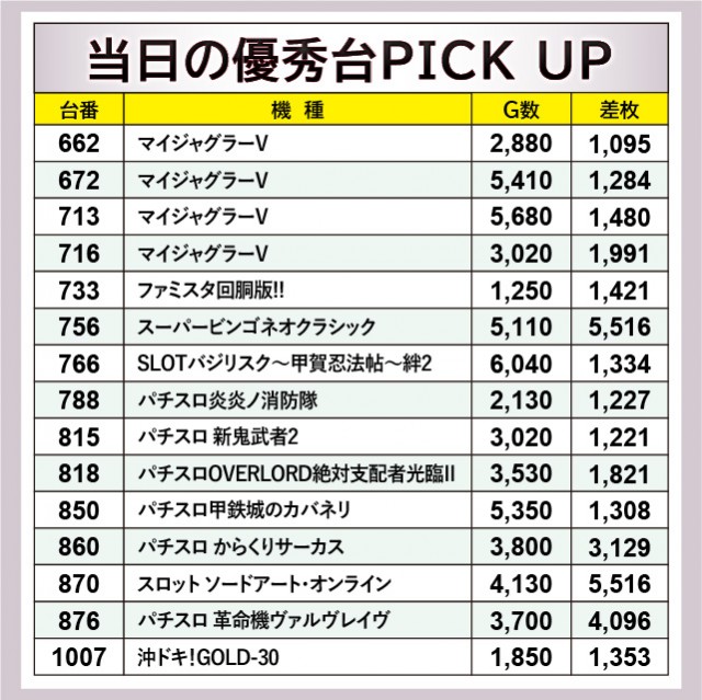『スーパービンゴネオクラシック』756番台+5,516枚・『スロット ソードアート・オンライン』870番台+5,516枚と、両機種の大きな熱気によって店内は盛り上がっていた。ほかにも『パチスロ からくりサーカス』860番台+3,129枚・『パチスロ 革命機ヴァルヴレイヴ』876番台+4,096枚と気を吐き、遊技していたファンは有意義な時間を過ごしていたことだろう。