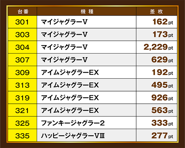ジャグラーシリーズは全種合わせて41台の設置。その中でも、8台設置のマイジャグ5がピックアップ台として4台挙がっている。回転数や合算が分からないので確かなことは言えないが、今回はマイジャグ5が目立っていたように見える。試行回数が増えればマイジャグ5推しなのか、ローテーションなのか、たまたまなのか見えてくると思うので、是非どのシリーズが目立っていた注目していただきたい。