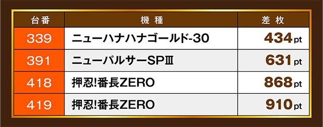 番長ZEROが6台設置で、11月のレポートでも4台ピックアップされていた。今回も2台とはいえ、毎回番長ZEROが挙がっていることを加味すると候補の一つとして片隅に置いてもいいのかもしれない。※リセ後はゼロモードスタートのため朝イチだけ打たれている可能性もあることに注意が必要。