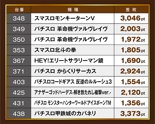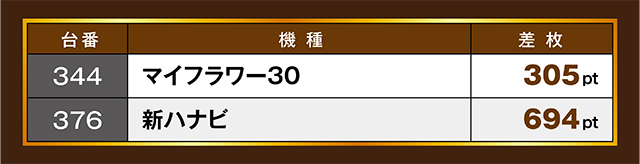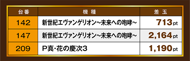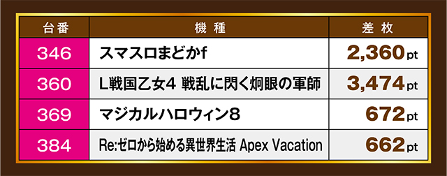 ここでも新台のマジハロ8が1/2でピックアップされている。一見大幅プラスのまどかfや乙女4に目が行きがちだが、一撃なのか判断がつかない。もちろん回転数が不明なのはマジハロも一緒だが、新台ということもあり、他の機種よりは回されていての結果だろうという推測のもと、爆の国でもあったように、新台かつ少数のマジハロ8は狙い目だったのではないだろうか。