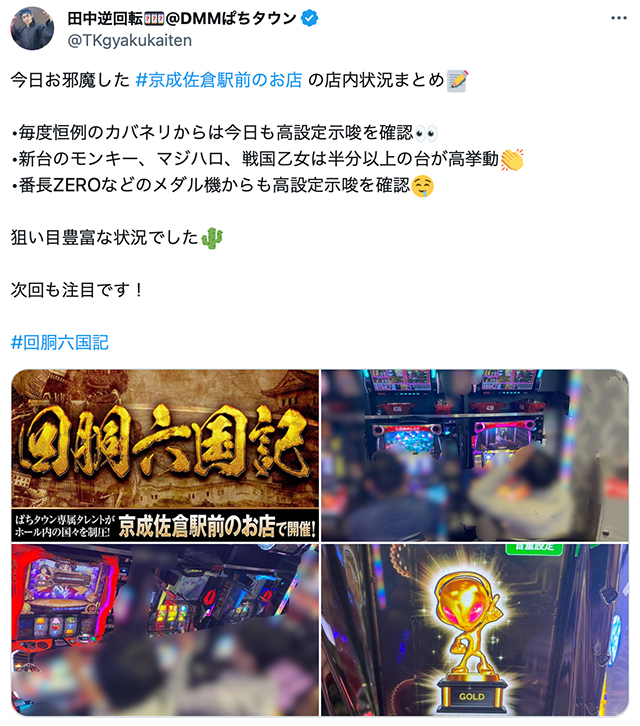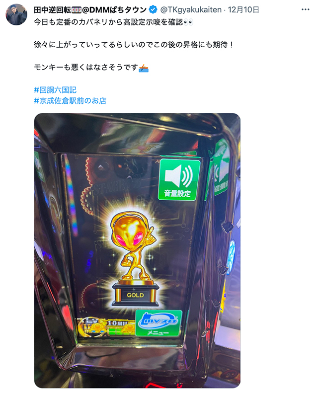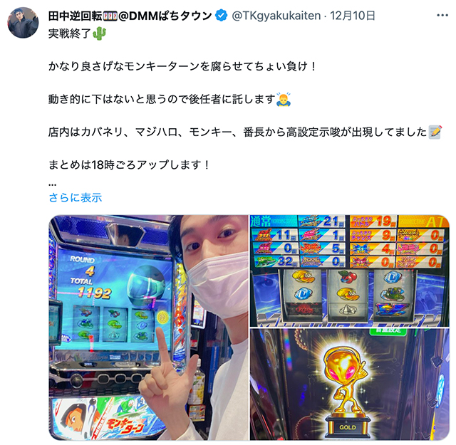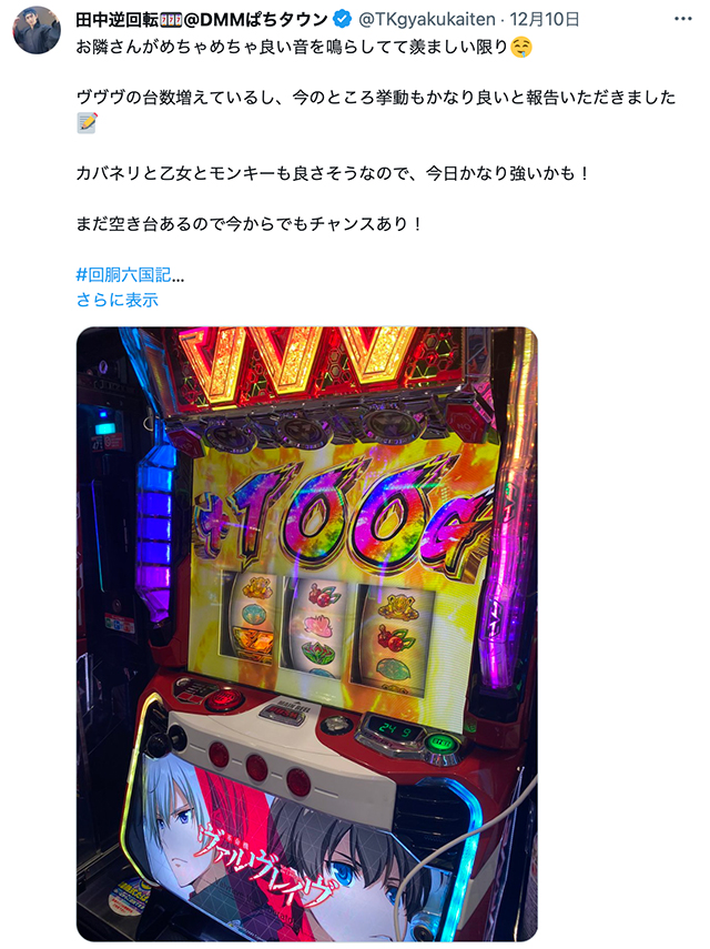 当日の田中のツイートを見る限り、ヴヴヴ が増台されており、ドライブも確認とのこと。新台のモンキーターンVも2台導入で1台ピックアップされている。11月のレポートでは2〜3台構成から機種1のピックアップが目立ったため、新台・増台かつ少数機種であれば狙う根拠としては厚くなるのではないだろうか。