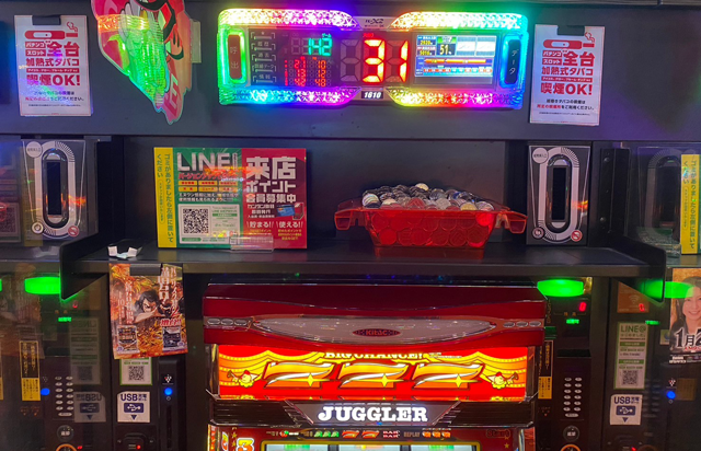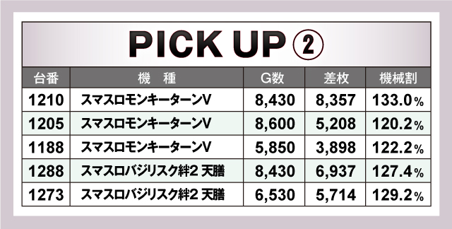 続いては当日店内を盛り上げた17台を紹介。とくに賑わいを見せていたのは、やはり最優秀台も獲得した「沖ドキ!GOLD-30」で間違いないだろう。1715番台の+8,806枚を筆頭に+5,000枚〜3,000枚クラスの台がズラリ! 設置台数が多いものの、必ずと言っていいほど良台が毎回確認できているので要チェックだ! その他「スマスロモンキーターンV」「スマスロバジリスク~甲賀忍法帖~絆2 天膳 BLACK EDITION」など、導入間もない最新機種やジャグラーシリーズから好記録が多数出現していた!