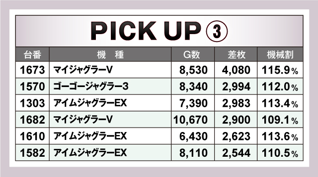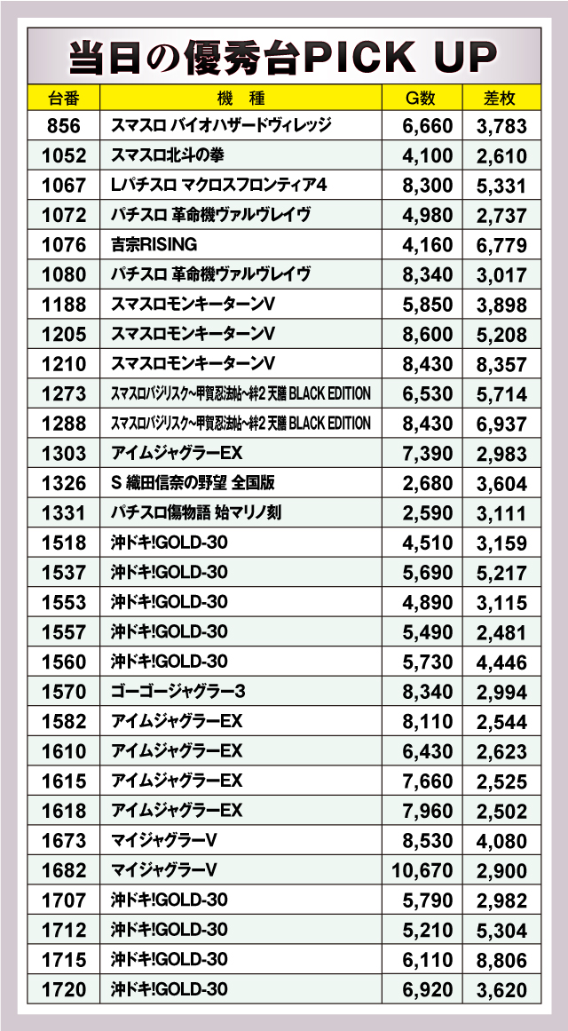 まずは優秀台30台のピックアップから。30台すべてが+2,000枚を超えており、+3,000枚オーバーは19台出現。それらの中でもっとも優秀だった台は、1715番台の「沖ドキ!GOLD-30」で、差枚+8,806枚と素晴らしい結果をマーク! ランクイン機種全体を見渡すと、スマスロなどハイスペック機種が大半を占める中、30台中8台がジャグラーシリーズという結果に。様々な機種に楽しめる環境が用意されていた可能性が高そうだ!