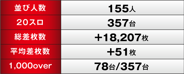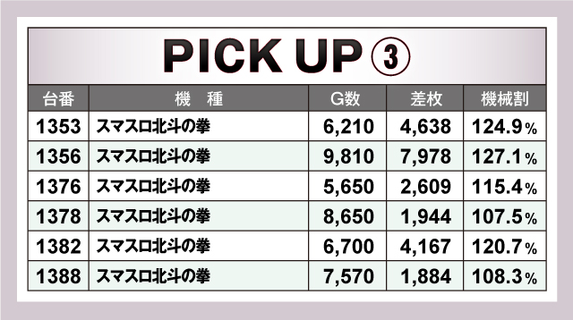 続いては、当日店内を盛り上げた3機種を紹介していこう。「アイムジャグラーEX」は、ノーマルタイプながらピックアップ6台平均+2,144枚の好調ぶりを発揮。また「沖ドキ!GOLD-30」は、6台平均+4,548枚で3機種の中でダントツトップの成績をマークしていた! そして「スマスロ北斗の拳」は、1356番台の+7,978枚を筆頭に好記録が続出! これら3機種以外にも好調台は多数確認できたので、様々な機種に注目して立ち回っていこう!