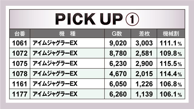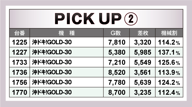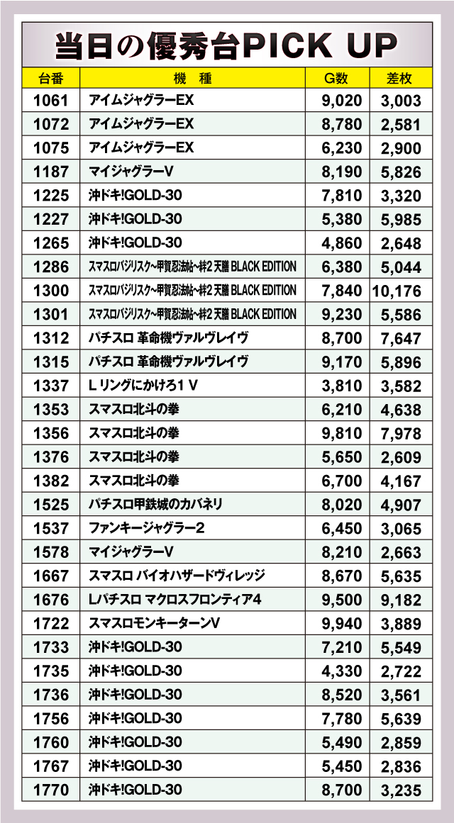まず初めに優秀台30台のPICK UPをチェックしていこう。30台すべてが+2,000枚オーバーで、+3,000枚オーバーは22台。そして+5,000枚オーバーは12台と好調台がズラリ! それらの中でもっとも好調だった最優秀台は、1300番台の「スマスロバジリスク~甲賀忍法帖~絆2 天膳 BLACK EDITION」で、差枚+10,176枚をマーク! 30台全体を見てみると、スマスロのほかに「沖ドキ!GOLD-30」やジャグラーシリーズが多数ランクイン。多くの機種にチャンスが隠されていたようだ!
