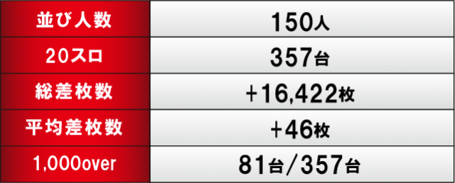今回、20スロ357台のトータル差枚数は+16,422枚で見事勝利を勝ち取った。前回の数字を上回ることができなかったが、同店のハイレベルを見せつける結果となった。また、好調を維持しての全台トータルプラス37連勝に成功し、40連勝も目前だ。次戦でも今回と同等、いやそれ以上の結果に期待できるため、ファン諸氏は引き続き同店の動向や情報を随一チェックしておくことをオススメするぞ!