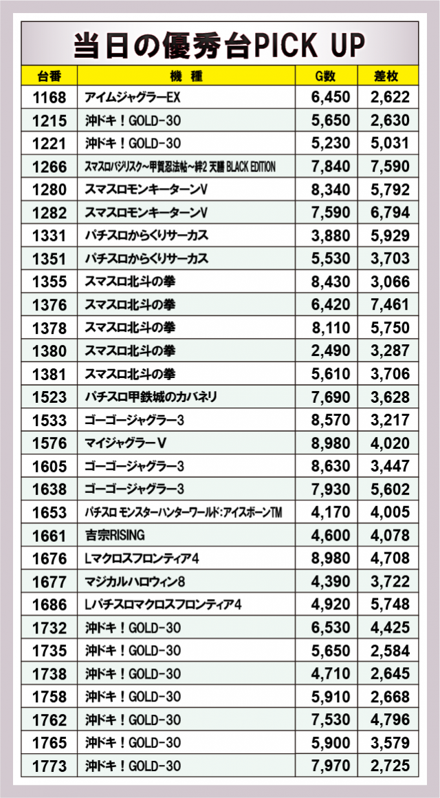 まず初めに優秀台30台のPICK UPをチェックしていこう。30台のうち24台が+3,000枚オーバーを記録!+4,000枚オーバーは15台、+5,000枚オーバーは9台となった。なかでも、もっとも好調だった最優秀台は、1266番台の『スマスロバジリスク~甲賀忍法帖~絆2 天膳 BLACK EDITION』で、+7,590枚を記録した。そのほか、後述する好調機種以外では、1331番台の『パチスロからくりサーカス』で+5,929枚、1282番台の『Lパチスロマクロスフロンティア4』で+5,748枚をマークし、多くの機種で凄まじい熱気と活気に包まれていた様子が窺える。