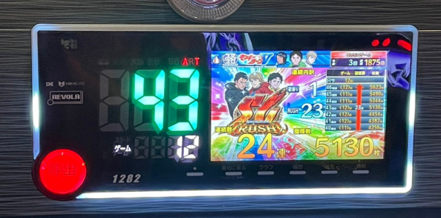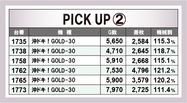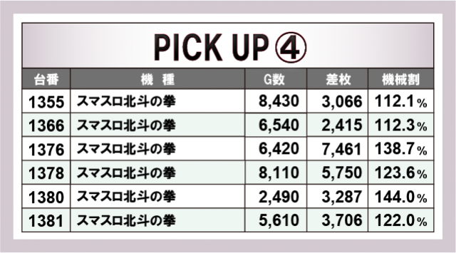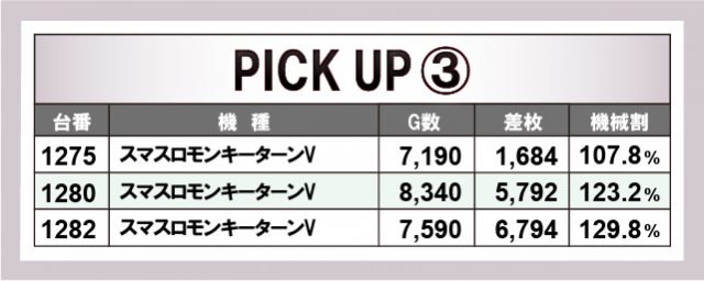続いては、当日の好調3機種をチェック。まず『沖ドキ!GOLD-30』は、合計12台のうち4台が+3,000枚オーバーで、なかでも1221番台が+5,031枚と大台突破に成功した。12台のトータル差枚数は+36,000枚オーバーを獲得し、当日の盛り上がりを牽引していた。次いで、『スマスロモンキーターンV』で、1280番台の+5,792枚を筆頭に3台のトータル差枚数は+14,000枚オーバーをマーク。そして、不動の人気機種『スマスロ北斗の拳』では、+3,000枚オーバーが多発し、6台のトータル差枚数は+25,000枚オーバーを記録した。