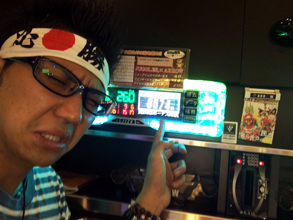 1万回転を達成すべく、ホールの前で気合いの入った謎のポーズ。この構えには元相撲部ということが関係あるのだろうか。