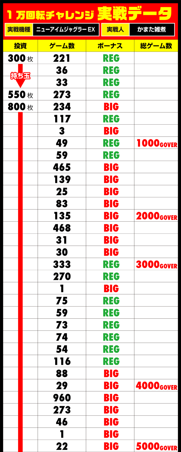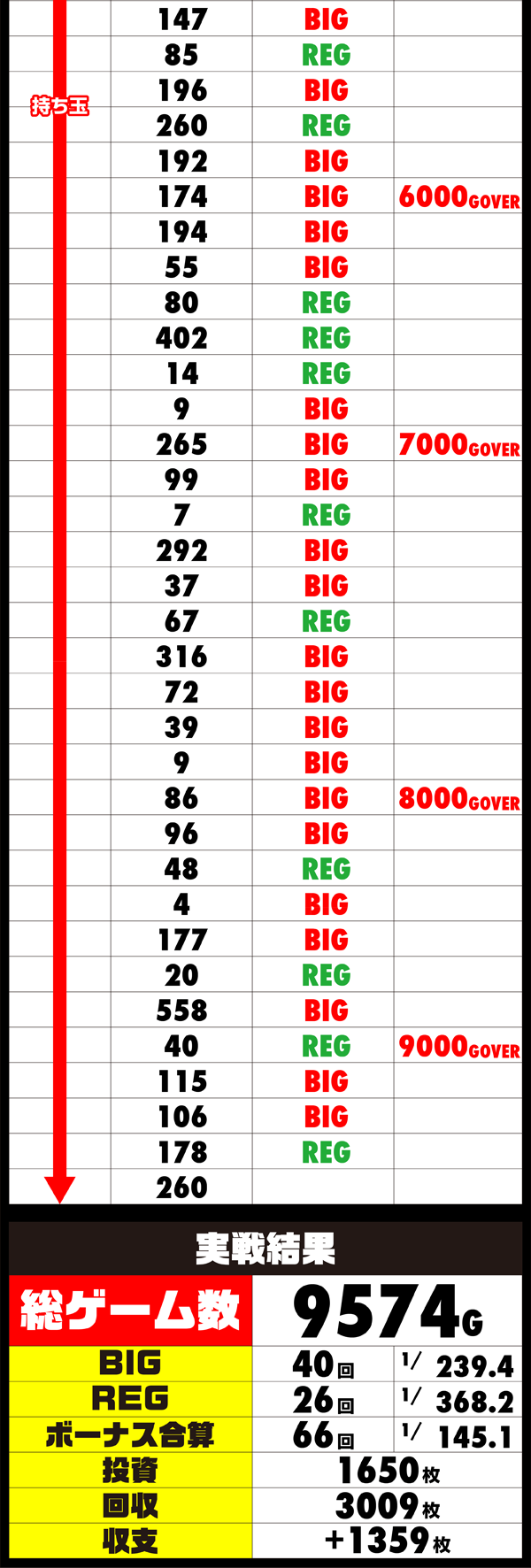 このまま、ゴールまで一直線と思いきや中盤からボーナスを連打。BIGに偏ってしまったこともあり、ボーナス消化といったうれしい悩みに直面するも、チャレンジ達成に向かってぶちかまし!