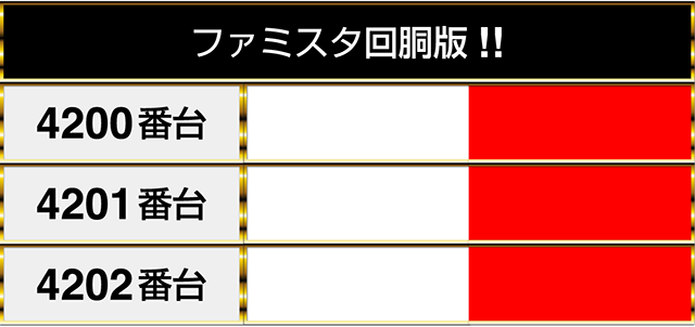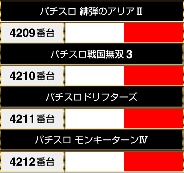 4209番台の『パチスロ 緋弾のアリアⅡ』から4212番台の『パチスロ モンキーターンⅣ』までも4台が連なってプラスptを記録!