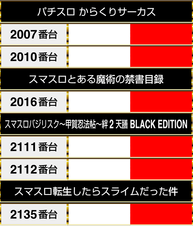 『スマスロとある魔術の禁書目録』の2016番台や『スマスロバジリスク~甲賀忍法帖~絆2 天膳 BLACK EDITION』の2111番台などもプラスptでこの日を終えた。