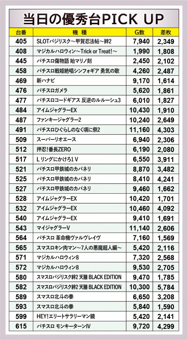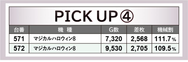 『パチスロ鋼鉄城のカバネリ』もまた8~9千回転台をマークする台が多々見られた。その中で525番台+4,241枚という記録が生まれ、大きな熱気を放っていたのが印象的だ。また『マジカルハロウィン8』全2台も活躍しており、9千回転台をマークするばかりか、2千枚OVERというコンスタントな記録を残し、同機種のポテンシャルを示していた。