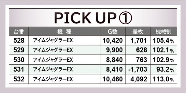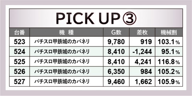 優秀台をチェックすれば分かるように、万回転OVERが多く発生していた。『ジャグラー』シリーズはもちろんのこと、同店にて絶大な信頼を寄せられている『パチスロひぐらしのなく頃に祭2』、人気機種『パチスロ鋼鉄城のカバネリ』は活気が絶えなかった。また新台『スマスロバジリスク~甲賀忍法帖~絆2 天膳 BLACK EDITION』も9千~万回転OVERを記録し、さらに582番台+5,784枚という熱気を放っていたのは目を見張るものがある。