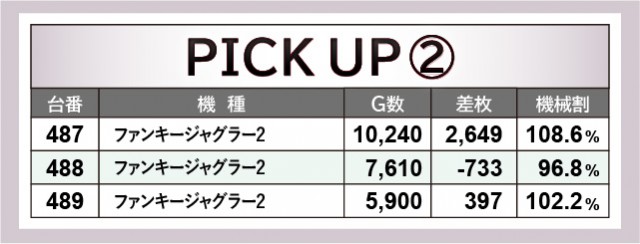 『アイムジャグラーEX』『ファンキージャグラー2』のエリアは活気が絶えず、532番台+4,092枚や487番台+2,649枚という熱気も確認できた。老若男女問わず愛される機種であるゆえ、ファンからの信頼は相当なものがある。また同店も丁寧に扱っている様子が窺えるため、今後も注目の機種であるのは間違いない。