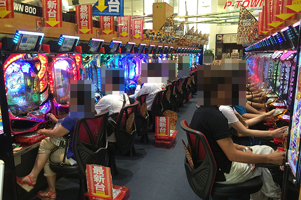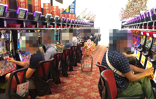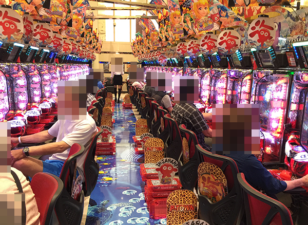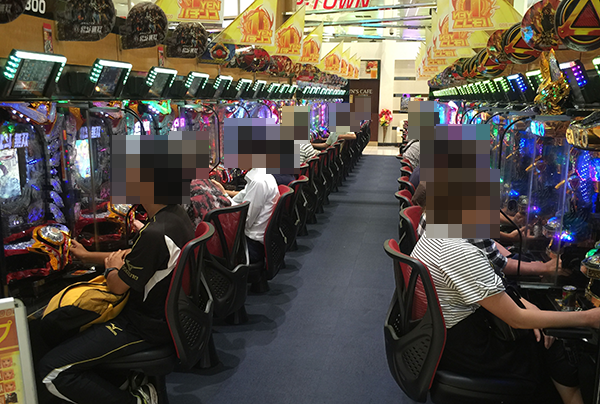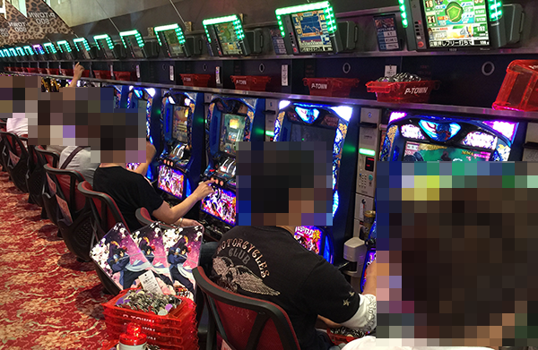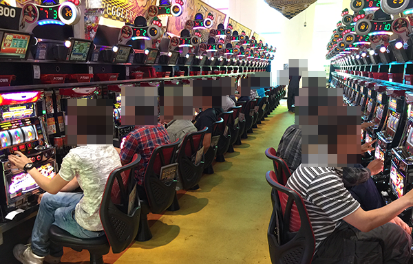 14時半ごろのホール内では、20円パチスロが盛況となっており、定番機種であるジャグラーシリーズがひときわ人気を集めていた。