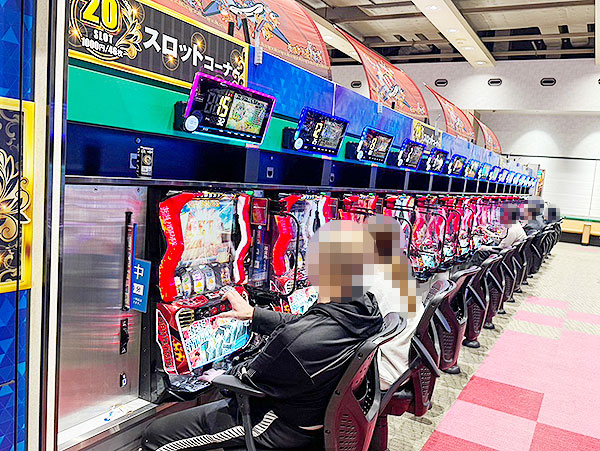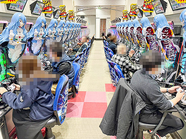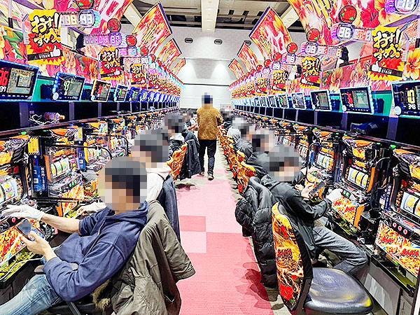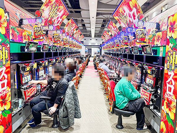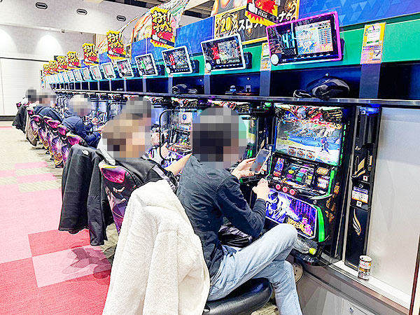 「スマスロバジリスク~甲賀忍法帖~絆2 天膳 BLACK EDITION」や「パチスロ炎炎ノ消防隊」なども盛況の様子。活気あるシーンが至る所で見られた。