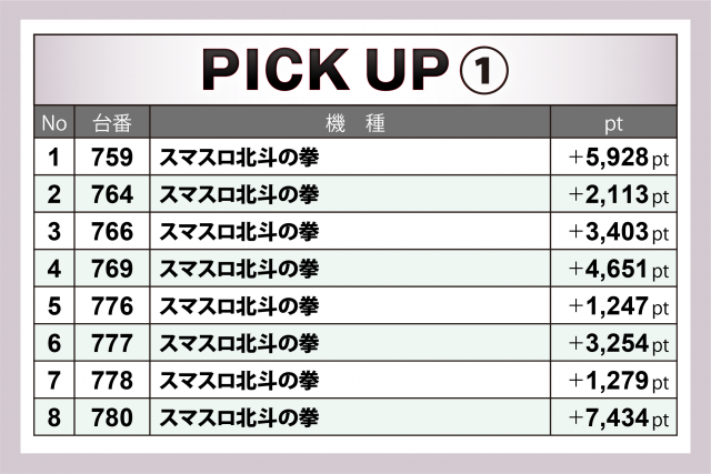 『スマスロ北斗の拳』24台ではプラス率が約54%(13台)と全体の半数強、1,000overは表の通り8台、780番台が+7千4百超&759番台が+6千弱と特に高い数値を残した。
