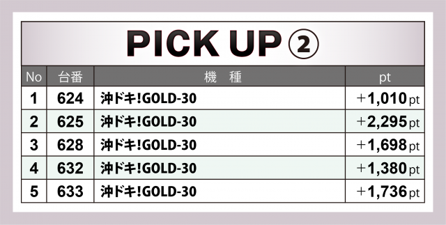 『沖ドキ!GOLD-30』20台。プラス台の割合は65%(13台)と『スマスロ北斗』を上回る勝率となり、5台が4桁のプラスを果たした。